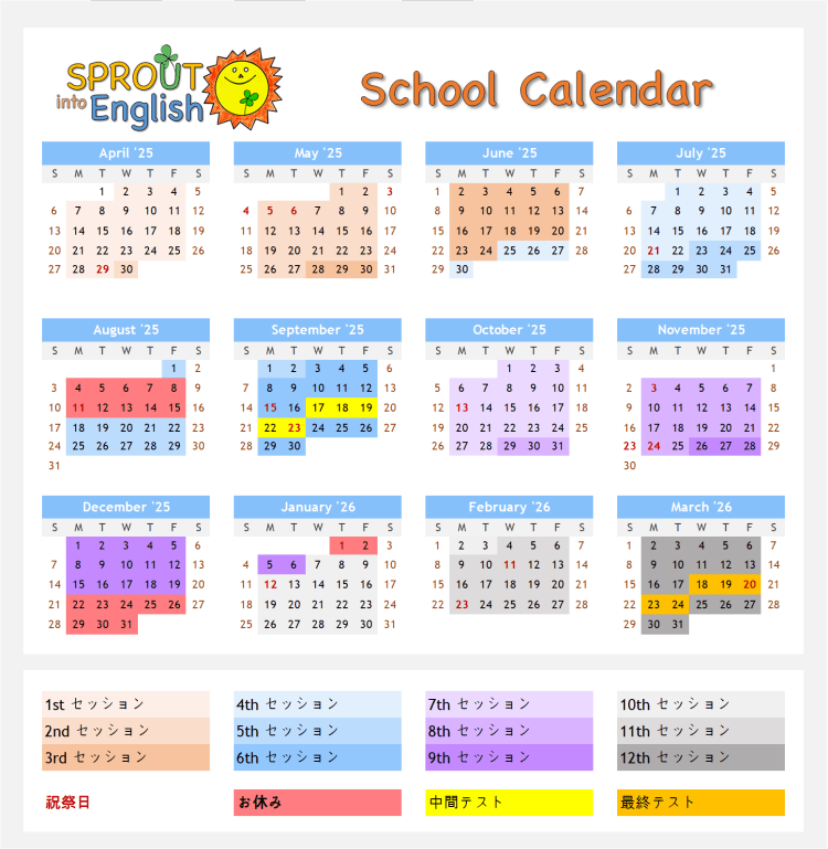 Calendar and Schedule ホームスプラウトについて 私たちについてスプラウトの先生クラス幼稚園から小学校上級クラス大人からビジネス特別や英検クラステストプレイスメント テスト中間テストと期末テスト入会のご案内入会手続き授業料 入会金ロケーションお問い合わせカレンダー教師用教材体験 4月2025から3月2026まで For inquiries or appointments, contact Cesar or Dani via email or a short message via LINE.お問い合わせやご予約は, セザルまたはダニまでEメールまたはLINEのショートメッセージでお願いします LINE Message 所在地とその他の連絡方法 Go backYour message has been sent Name(required) Warning Email(required) Warning Phone Warning Message Warning Warning. SubmitSubmitting form Δ